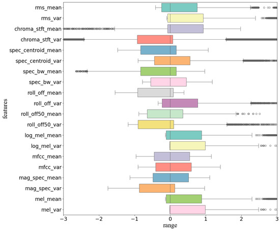 Normally, the presence of data outliers adversely impacts the training of the deep learning models. Typically, outliers are data points that significantly deviate from the features’ distribution. They can distort model performance by skewing the training and lead to inaccurate classification. Therefore, the dataset was examined for outliers. To identify outliers in the SNR-varied acoustic dataset, box plots visualized the features’ distributions, as shown in Figure 7. However, outliers within the feature were retained in this study because the vocalizations have rich spectra that span a wide range and are not considered as outliers.