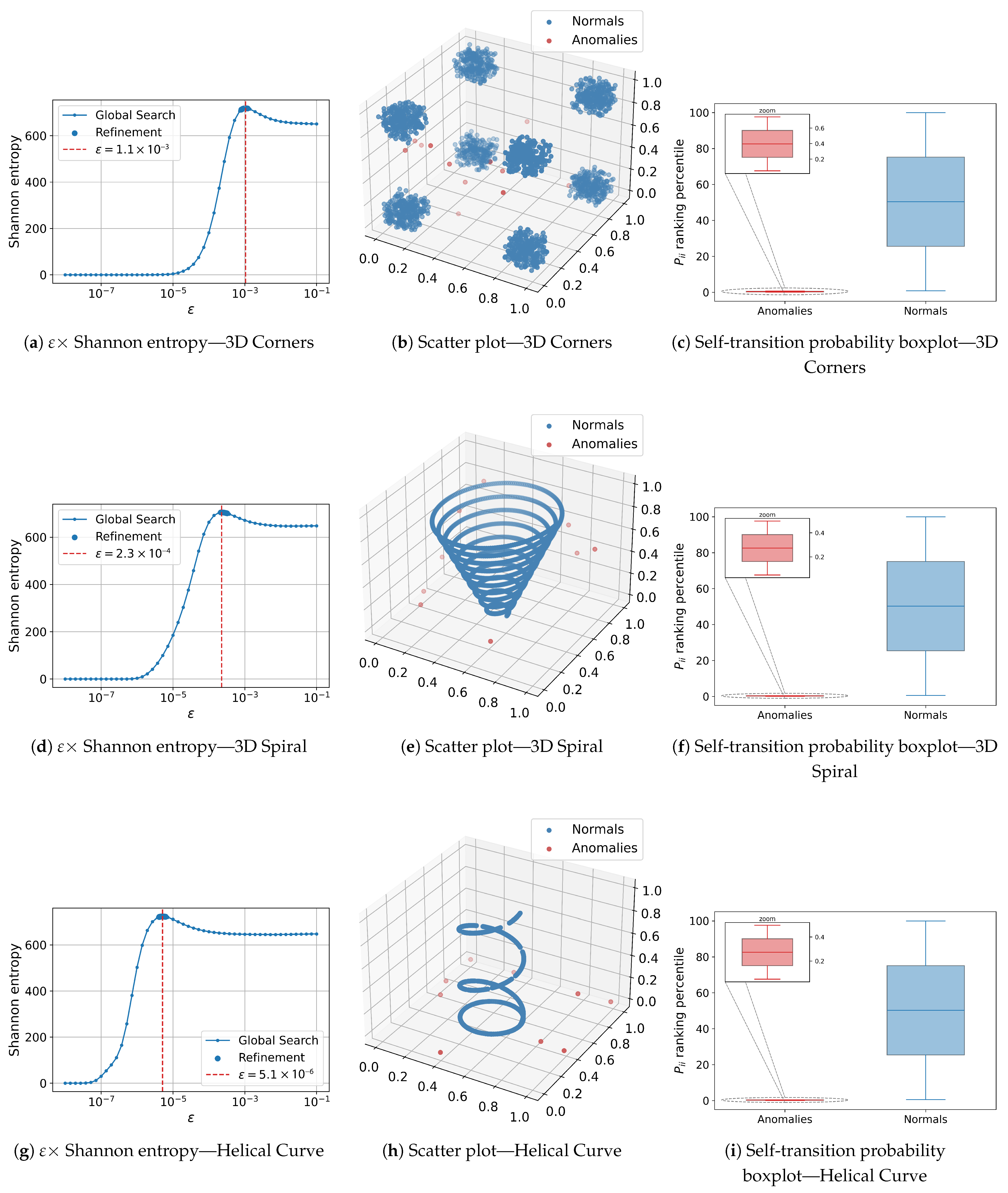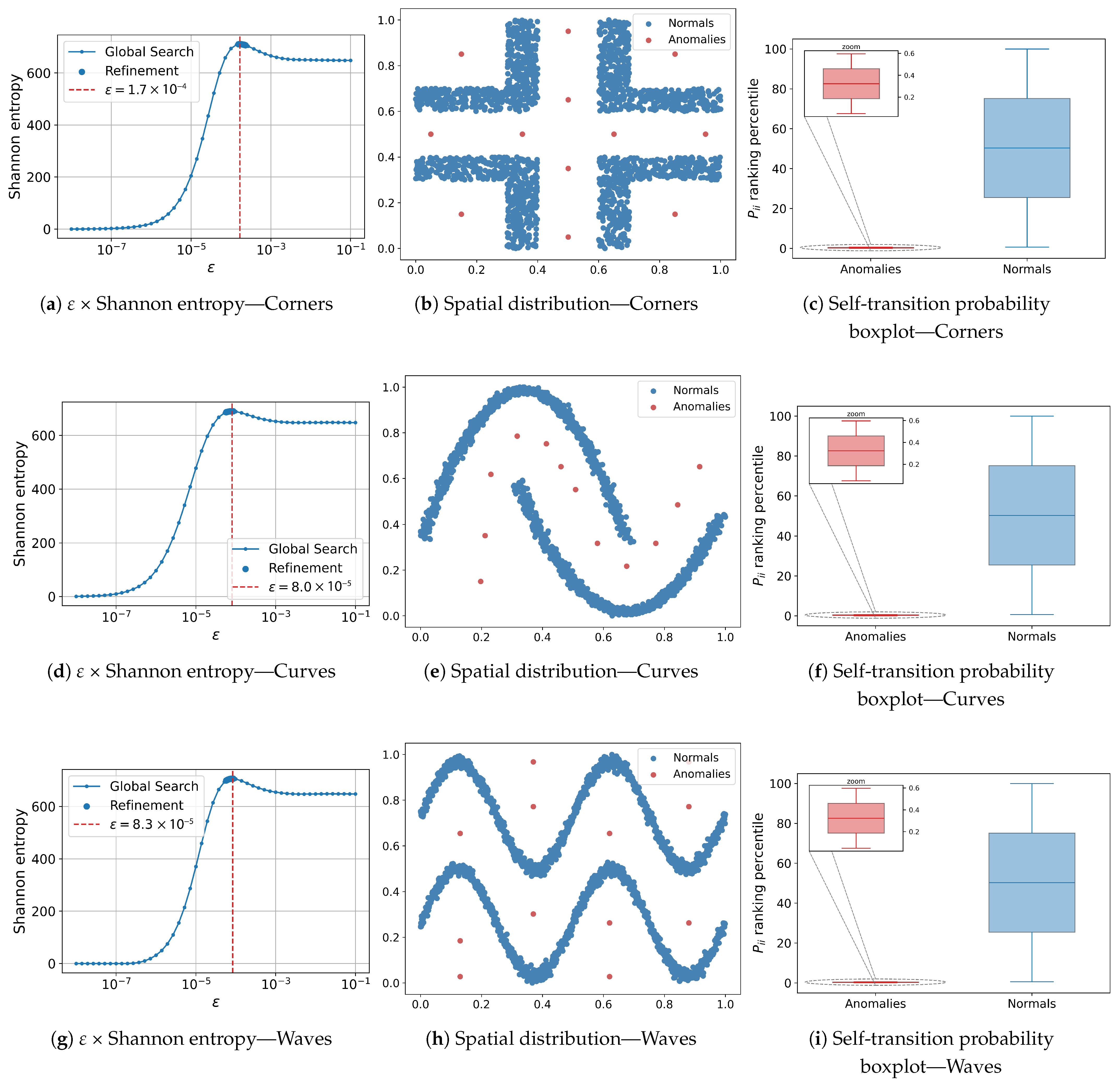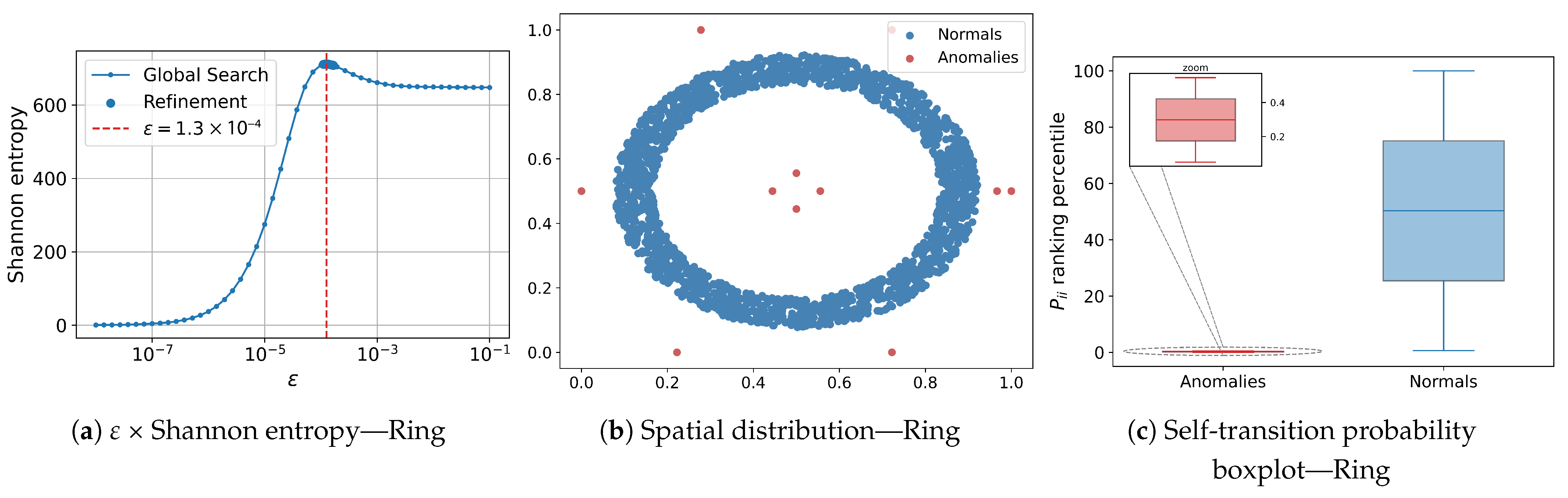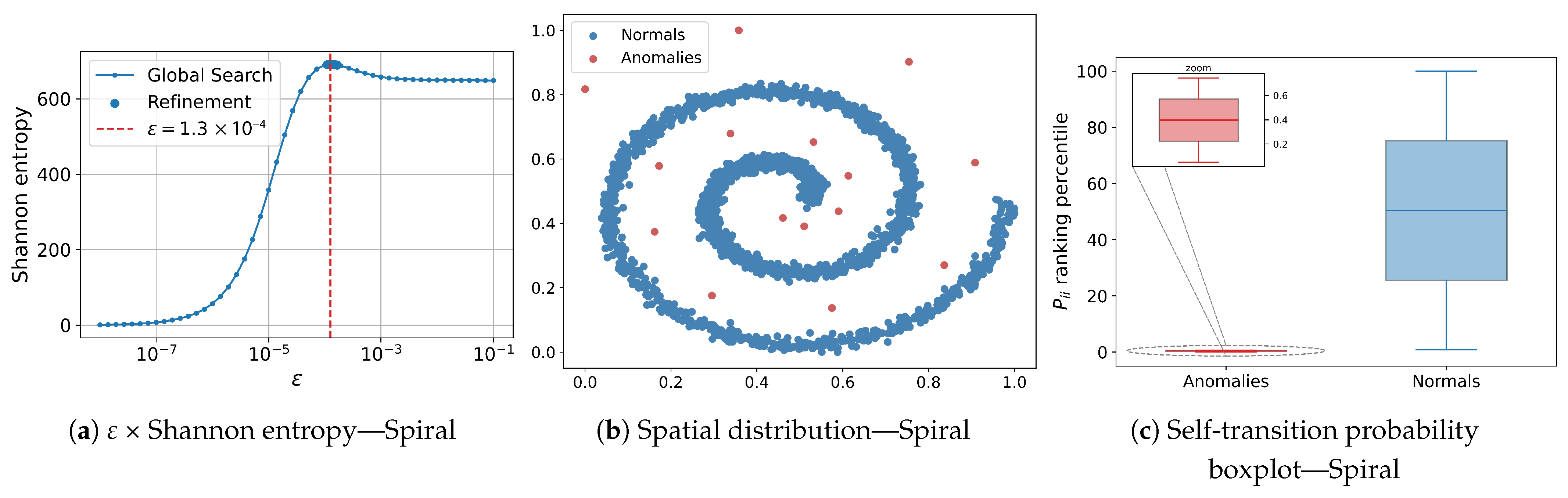 –Shannon-entropy curve used to select the scale parameter; (ii) the spatial distribution of instances classified by AD-MGD (blue = normal, red = anomaly); and (iii) a boxplot of the self-transition probability rank percentiles, where normal data exhibit a wide interquartile range and a central median, whereas anomalies are compressed into a narrow rectangle near the lower bound; a zoomed inset highlights the low internal variability of the anomalous group.