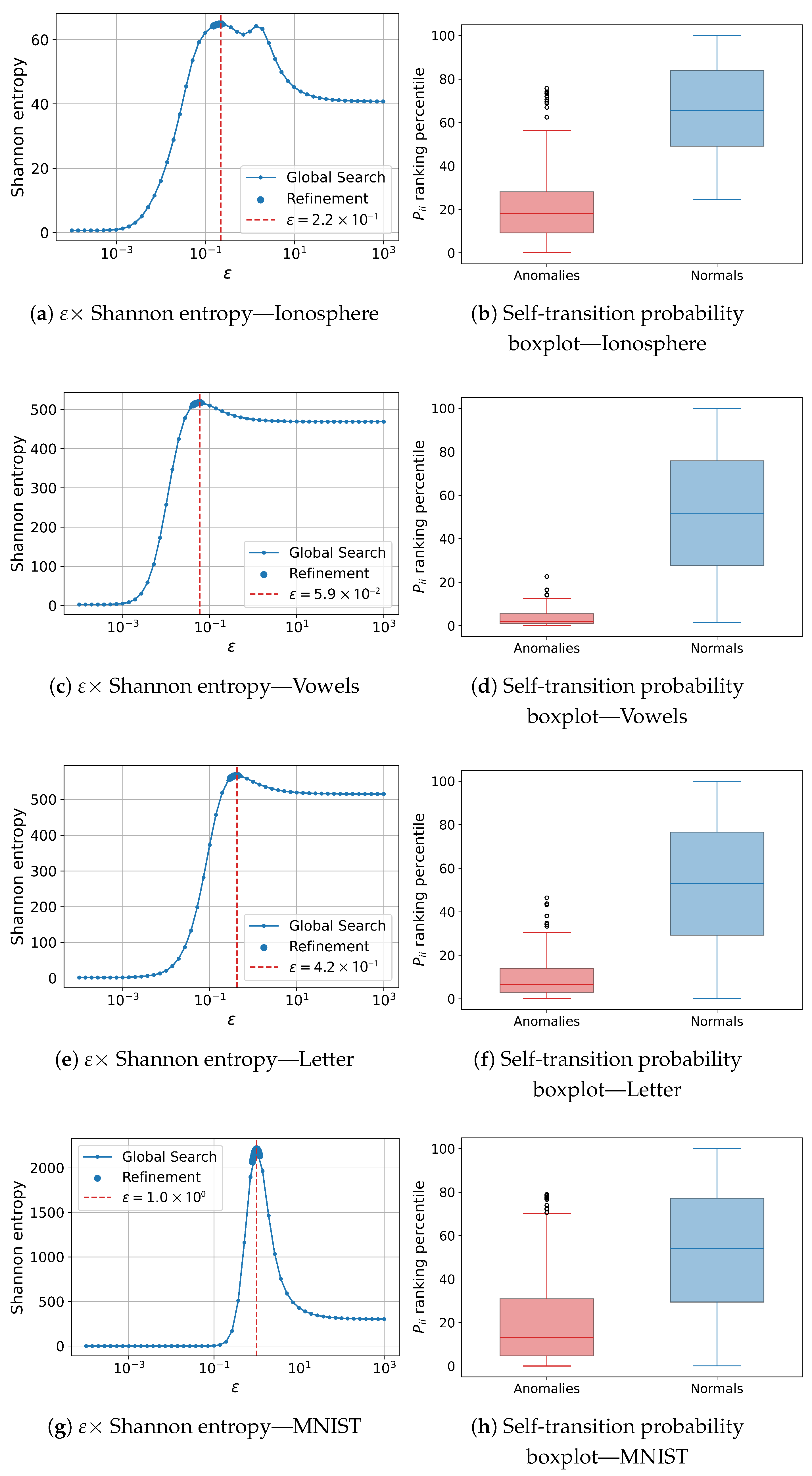 × Shannon-entropy curve whose maximum defines the scale parameter; and (b) the boxplot of the self-transition probability ranking positions, which highlights the systematic shift of anomalous scores toward lower percentiles, reinforcing the algorithm’s discriminative power.