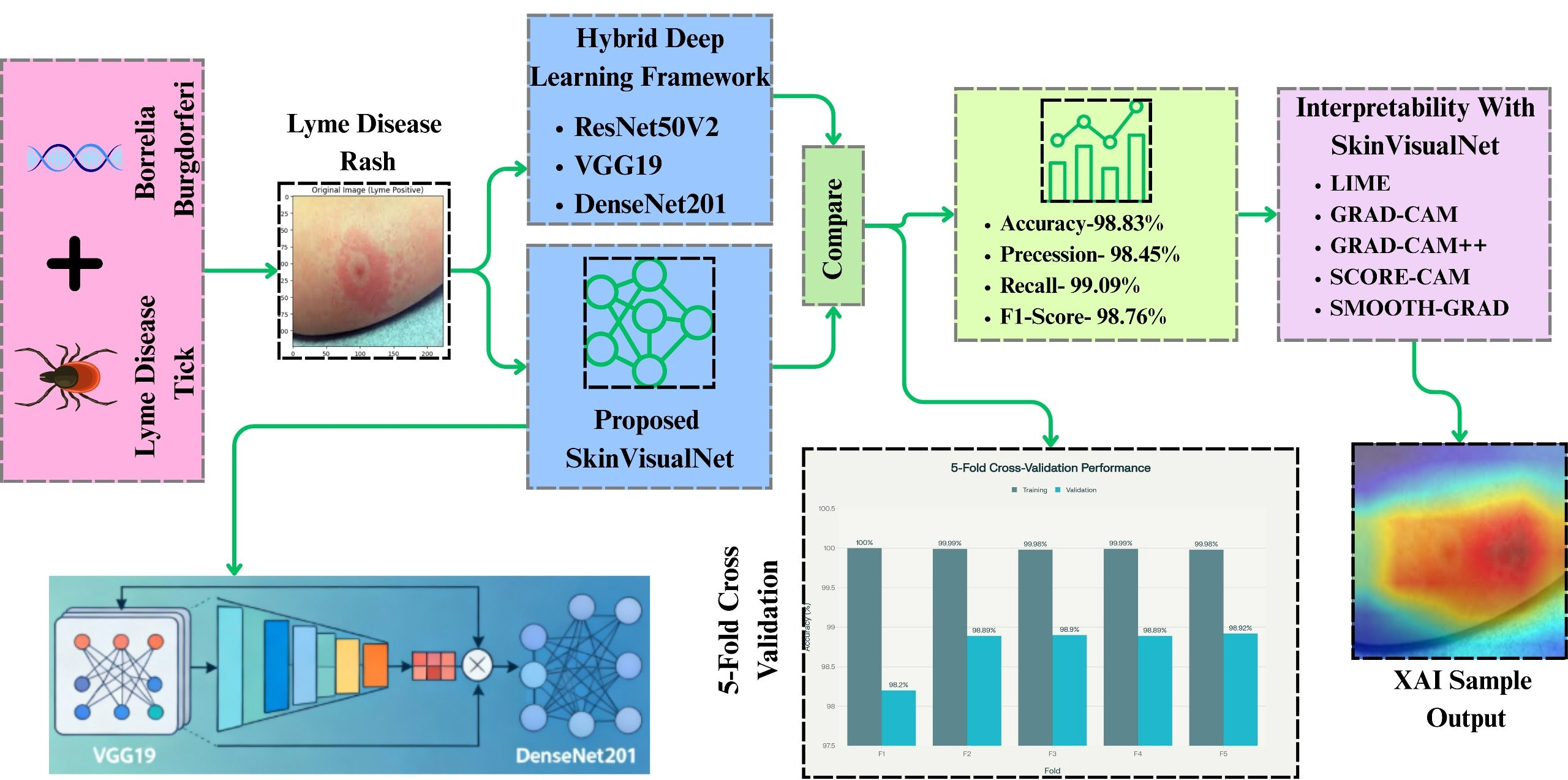 | SkinVisualNet | Public Kaggle Lyme rash dataset | Kaggle-derived Lyme disease rash images with augmentation and preprocessing | LIME, Grad-CAM, CAM++, Score-CAM, SmoothGrad | 98.83% |