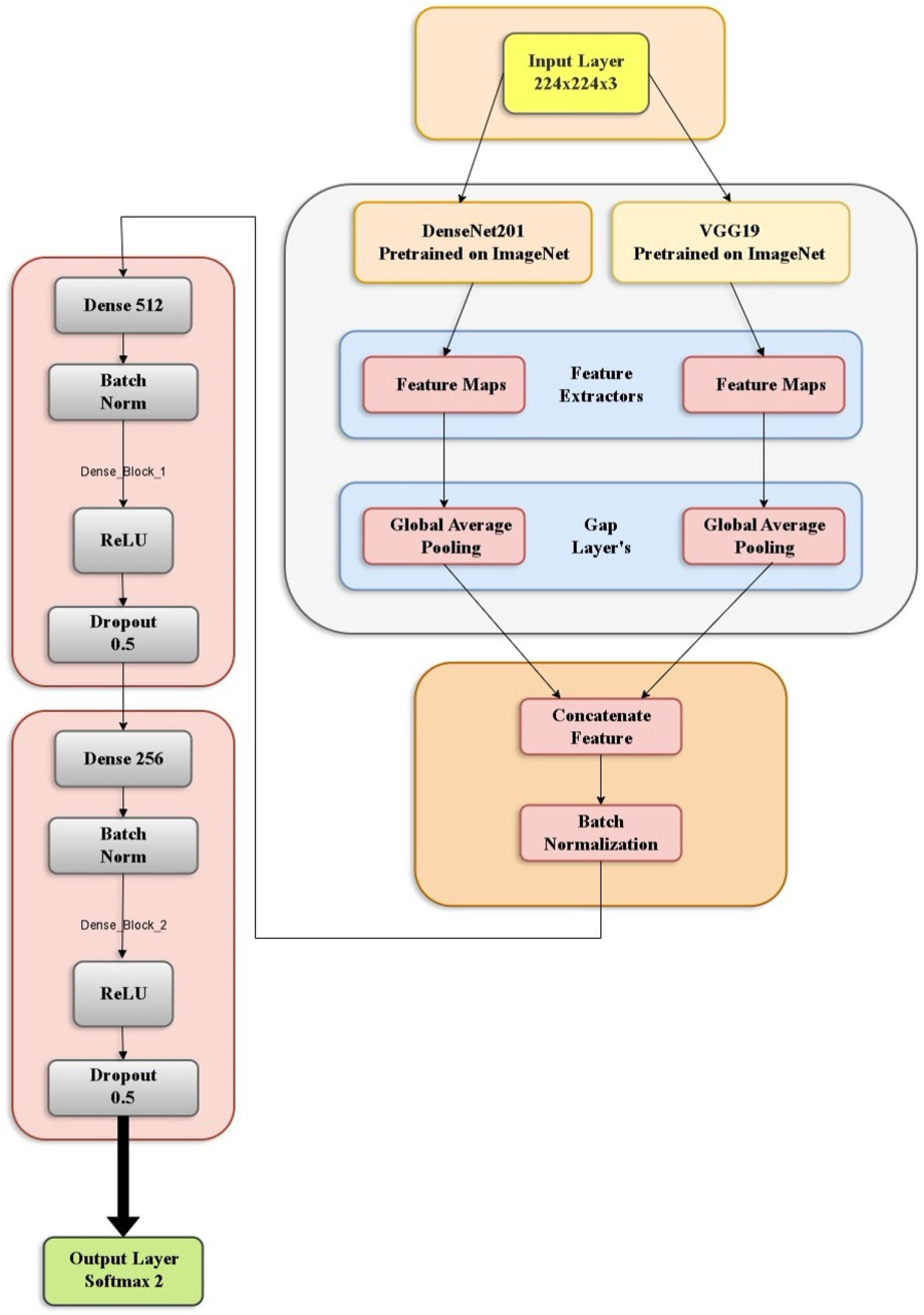 | Concatenate | Concatenation | 0 | (None, 1920), (None, 512) | (None, 2432) | Concatenation of DenseNet201 and VGG19 outputs. |