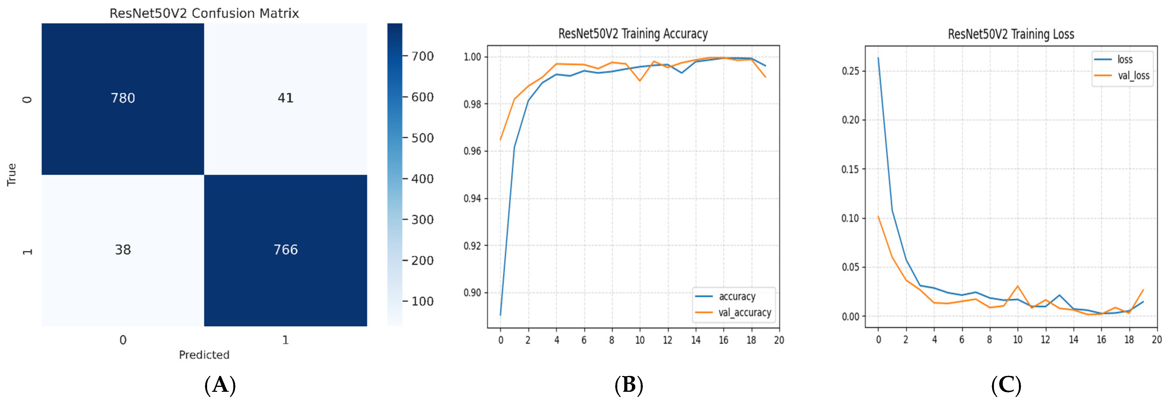 | ResNet50V2 | Conv1 | 7 × 7 | ReLU | MaxPooling (3 × 3, stride 2) | Adam | None | 0.00001 | 1430.79 |