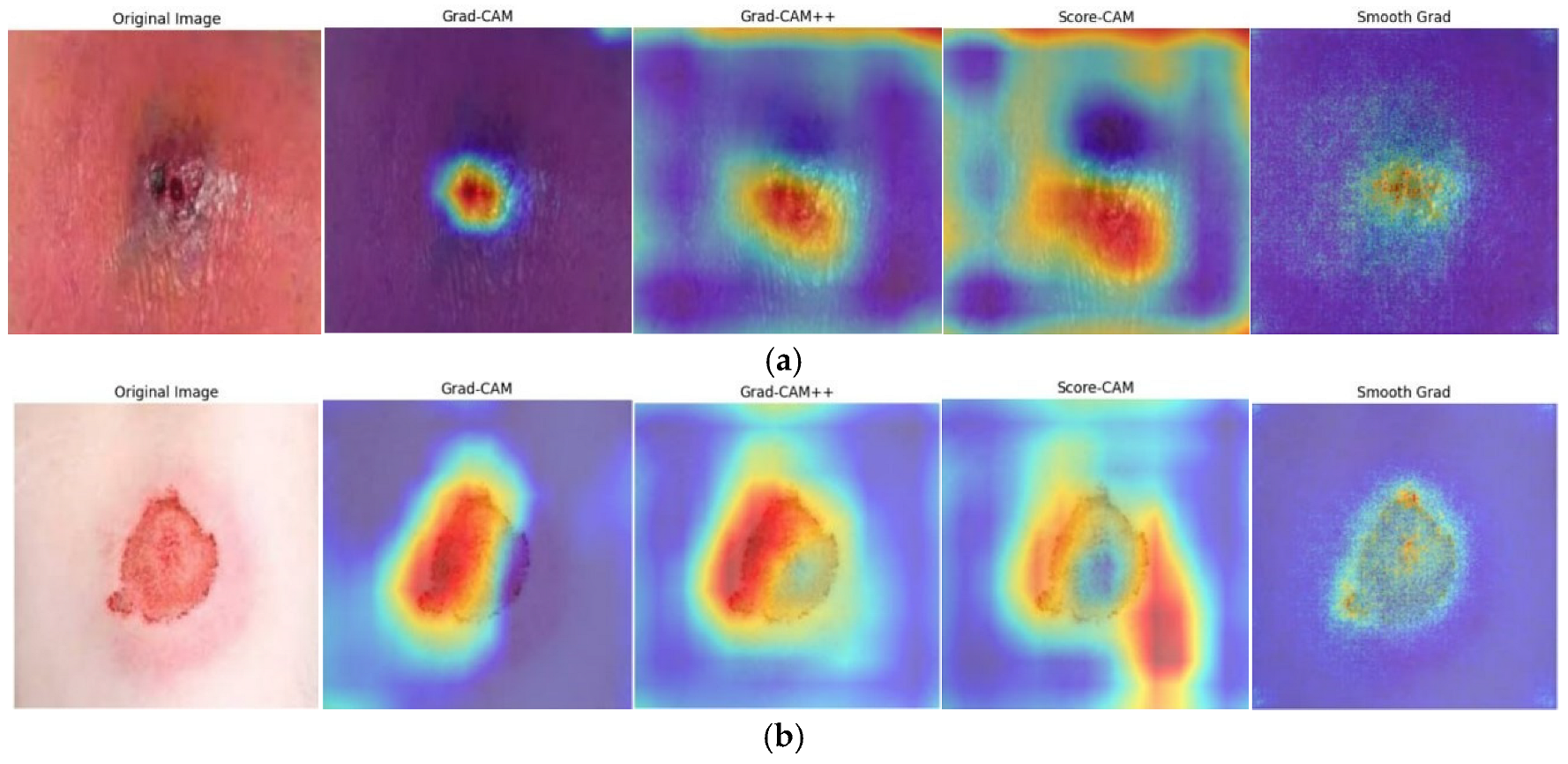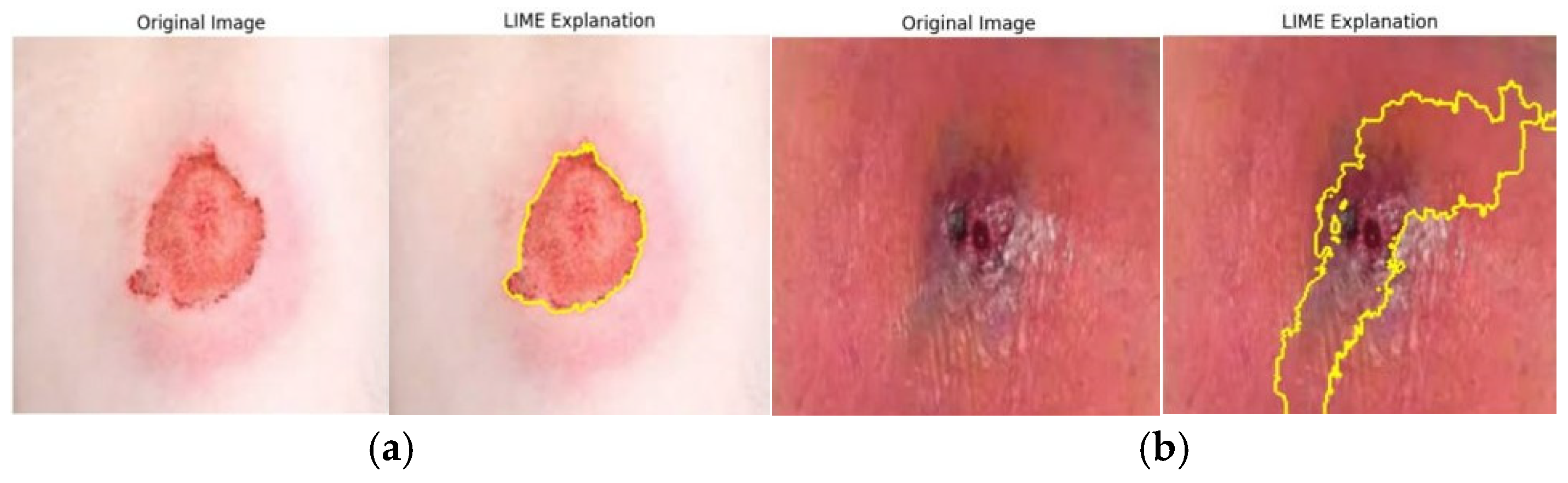 - Mohan, J.; Sivasubramanian, A.; V., S.; Ravi, V. Enhancing skin disease classification leveraging transformer-based deep learning architectures and explainable AI. Comput. Biol. Med. 2025, 190, 110007. [Google Scholar] [CrossRef]