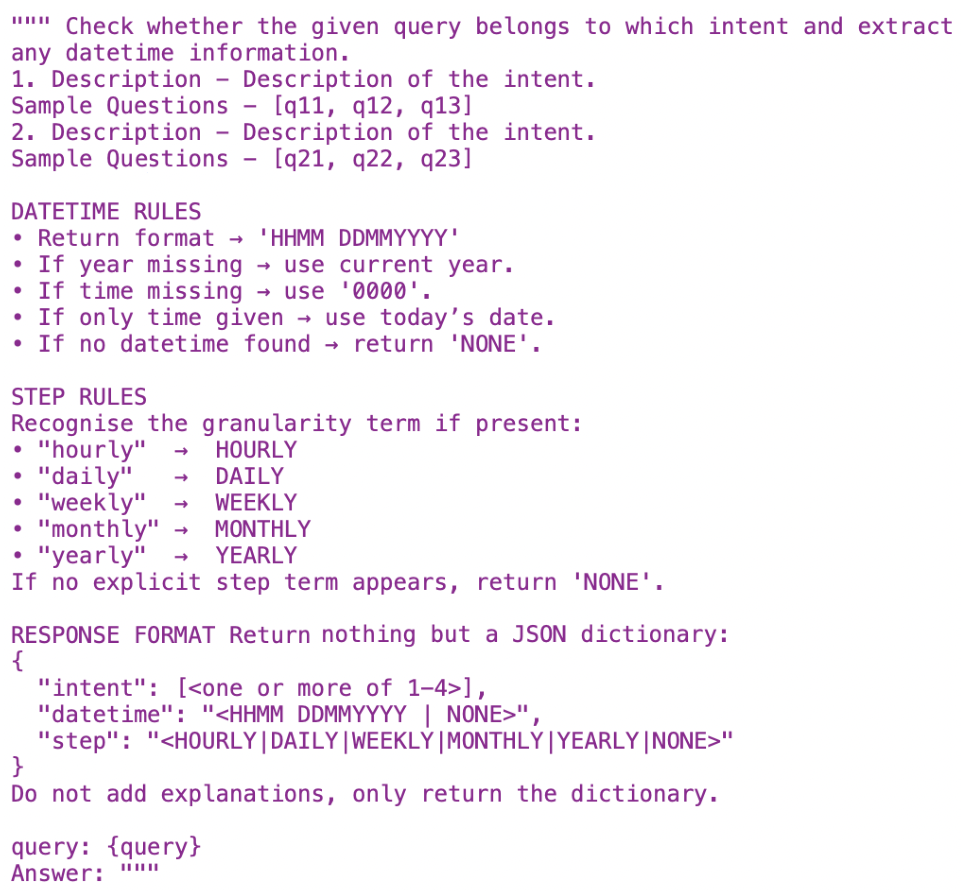 When the agentic core module receives queries, it undergoes initial processing. Its core function is to interpret these queries and extract key information for further processing steps. The intent extractor is vital for effectively interpreting user inputs. The following prompt in