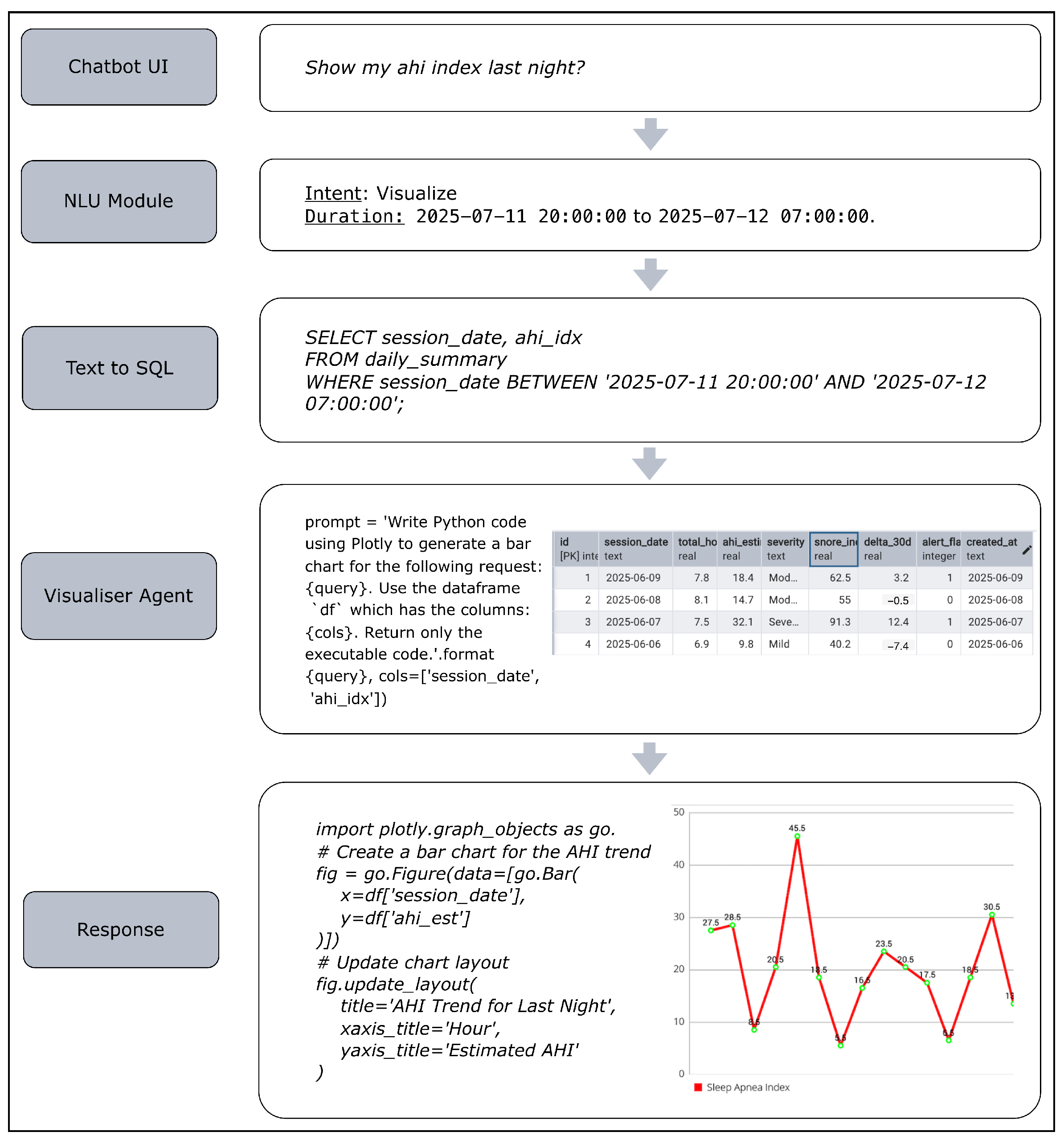 | Visualiser (Plotly v4.0.0 Generator) | Receives the analyser’s JSON and optional date range; generates Plotly code that renders charts (e.g., 14-night AHI bar plot with 7-day moving average), which the sandbox executes on-device.