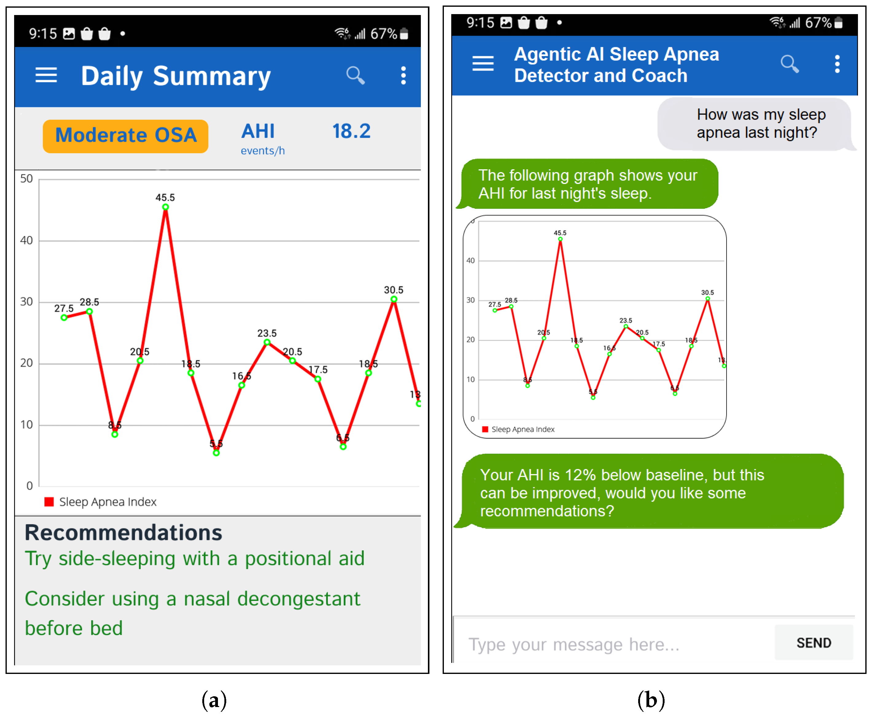 28]. The four agents are the following: (1) Classifier Agent: It detects apneic events from MFCC features using Random Forest classification. (2) Analyser Agent: It manages nightly records and computes the Apnea–Hypopnea Index (AHI). (3) Visualiser Agent: It produces summaries and trend plots. (4) Sleep Coach Agent: It provides recommendations based on sleep data and a related evidence base. The entire framework was demonstrated and empirically evaluated on a standard smartphone using a quantised Llama 3.2-1B-Instruct-Q4 model. This bedside setup ensures that OSA detection and management can occur without the requirement for external sensors or specialised laboratory equipment [