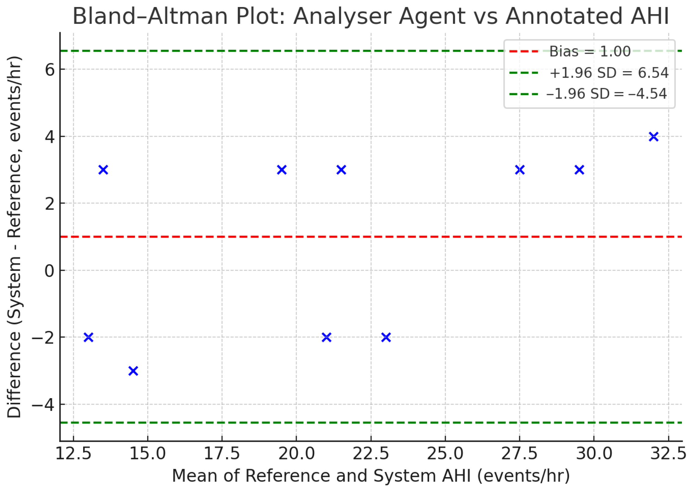 Figure 5. The plot illustrates the difference between the system and reference AHI against their mean for each recording. The analysis revealed a mean difference (bias) of +1.0 events/hour, indicating a slight systematic tendency for the Analyser Agent to overestimate the AHI compared to the reference standard. The 95% limits of agreement were −4.54 to +6.54 events/hour, with all ten data points from