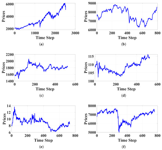This dataset includes the Shanghai Stock Exchange (SSE) and provides daily historical prices of Chinese stocks [2]. The symbol 600728 indicates the unique stock code of a Chinese IT company assigned to Pci-Suntek Technology, and is the suffix for the SSE in China’s primary stock market. Each data entry contains the date, price, opening price, maximum intraday price, minimum intraday price, volume, and percentage price change. Figure 1e shows the dataset values from 28 January 2019 to 26 January 2022, capturing 730 trading days of market activity.