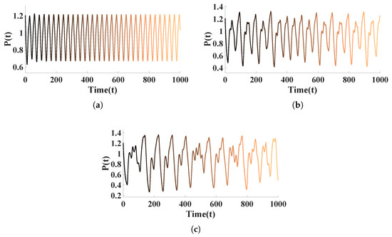 Mackey–Glass equation time series for different values of : (a) , (b) , and (c) .