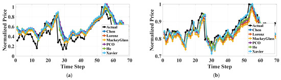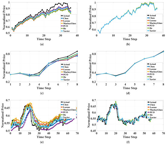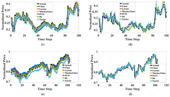 The proposed models’ predictions overlaid on the actual data with all chaotic systems: (a) GRU for S&P 500 dataset, (b) ESN for S&P 500 dataset, (c) GRU for ISEQ dataset, (d) ESN for ISEQ dataset, (e) GRU for XAU/USD dataset, and (f) ESN for XAU/USD dataset.
