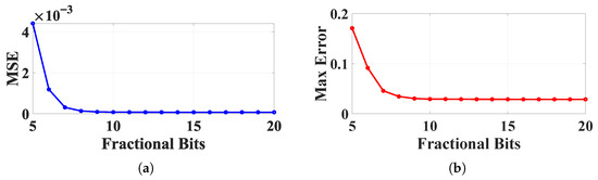Error comparison between floating-point, represented by the built-in function ‘’ in MATLAB, and fixed-point approximation: (a) MSE for different fractional bits and (b) max error for different fractional bits.