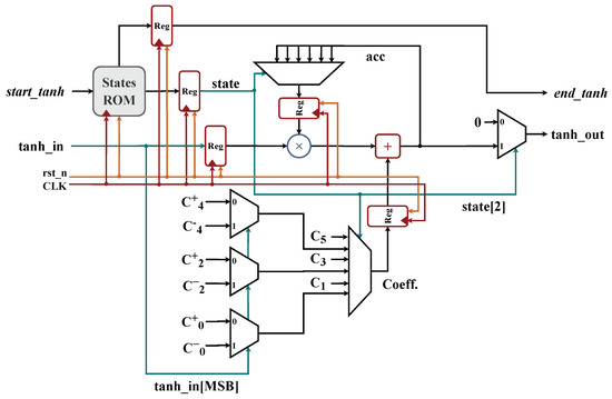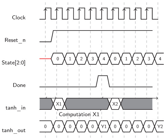 The implementation of the function is applied element-wise. The hardware architecture of the tanh implementation consists of only one multiplier and one adder, as shown in Figure 11. The timing diagram in Figure 12 of the ‘’ module shows two complete computation cycles for inputs and , demonstrating the pipelined nature of the hyperbolic tangent calculations. The control signal ‘’ is the positive edge clock, is the negative edge reset, and the output flag is . The controller state ‘’ has values from 0 to 4. The output values from ‘’ are and . The vertical dashed lines mark the clock edges, and the arrows indicate the computation latency, which is five cycles. The labels represent the computation phases. The input is latched in the first cycle (state 0), and the polynomial is evaluated through states 1 to 4. The first output is carried out at the fifth cycle with output signal ‘’ at state 4. The second input is latched in the sixth cycle in state 0.