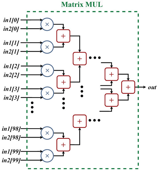 Multiplication operations are computationally intensive and dominate resource utilization. The only two multiplication operations are the state prediction ‘S_pred’ and the output prediction ‘Y_pred’ in Equations (11) and (14). The multiplication implementation for two 100-element vectors is described by the following equation: