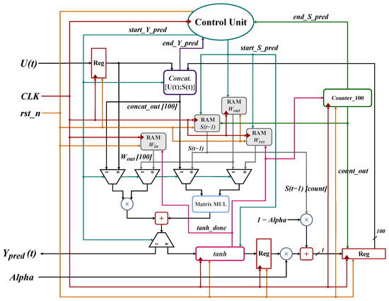 Figure 14 illustrates the top module of the proposed ESN for the updated state and the predicted output calculations. The weights , , and and the previous state are obtained from the software training process and then stored in memory blocks (RAMs). The size of is , is , is , and is . The address of the RAM for and accumulates when the signal ‘’ is activated. The shared block ‘Matrix_MU’ calculates the matrix multiplication operations of size 100 for the updated and prediction states. The 8-bit counter ‘Counter_100’ counts from 0 to 99 for each neuron index. This counter manages the state update and the output prediction operations, generating the control signal ‘’ after reaching the value 99.
