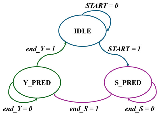 The control unit of the top proposed model in Figure 15 consists of three states. The ‘’ state indicates the end of the prediction process at ‘’. The ‘’ state computes the new reservoir state . The prediction output state ‘’ computes the final predicted output when the signal ‘’ is activated.