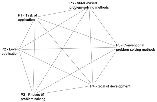 In equivalence classification, each feature belongs to one class exclusively, while the compatible maximal combinations (), built from binary relations (), contain one and only one feature from each class. For example, the various tasks and levels of manufacturing systems, the various computational methods, etc., determine the feature equivalence classes, while compatibility of properties is declared by the binary relations between them (e.g., between a given task or level and a given AI-based computational method, etc.).
