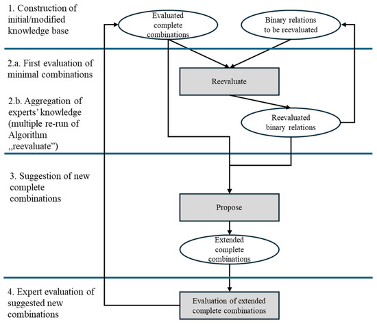 Considering the huge number of possible combinations on the one hand, as well as the heuristic knowledge of collaborating experts on the other, it is an effective way to generate the possible tendentiously better combinations in the above outlined RPS framework. In this methodology, the features (characteristics, properties, etc.) of analyzed solutions are described by a compatibility lattice (Equations (1)–(6)), consisting of feature equivalence classes (Equation (7)) and binary compatibility relations (Equation (8)) between the elements of the various classes.