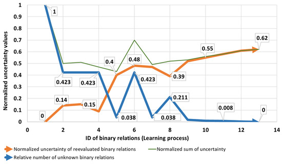 - The set of partial property combinations and ultimately the set of smallest binary relations () can take place in multiple solutions of different values, so their evaluation is uncertain.
