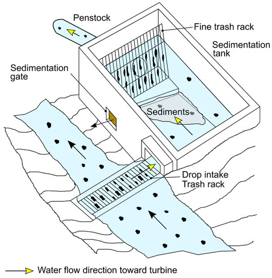 Schematic of a weir in a run-of-river SHP with trash racks and sedimentation tank.