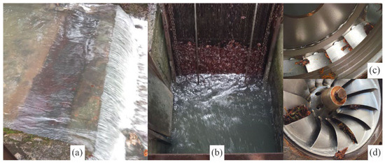 Run-of-river SHPs are the most common type of small hydropower plants. Their main components include a weir, a settling tank, a penstock, and a water turbine [6,7]. Water is diverted from the main river through an intake at the weir with minimal or no water stored in it. The intake features a trash rack designed to protect the turbines from large debris, including stones, timber, leaves, and man-made waste carried by the stream. Leaves and waste are filtered out at the trash racks, while sand settles in the settling tank (Figure 1). For low head applications, the settling tank may be integrated into the stream or turbine intake [6]. The sand is released from the tank through the sedimentation gate. The trash racks are cleaned manually or with automated trash rack cleaning systems. Some particulate matter still enters the penstock, potentially causing clogging or turbine erosion. Smaller turbines are particularly susceptible to clogging by leaves. Representative examples of the operational challenges in SHPs are illustrated in Figure 2. The Tyrolean intake is partially clogged with leaves (Figure 2a), the main intake gate is entirely clogged with leaves (Figure 2b), and the guide vanes together with the Francis runner outlet gaps are partially blocked (Figure 2c,d). The trash rack clogging is related to the long events and stops, while turbine cleaning is related to short stops.