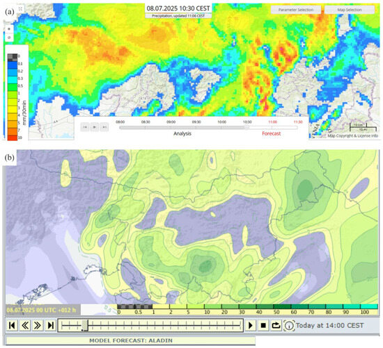 Weather prediction visualization for the Slovenian alpine region from (a) INCA-CE nowcasting and (b) ALADIN regional weather forecast, adapted from ARSO—Slovenian environmental agency [29].