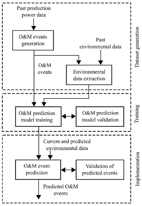 The predictive O&M model for O&M activities is developed using historical power production data and environmental parameters acquired in a synchronized manner. The methodology for forecasting O&M events comprises three distinct phases (Figure 4).