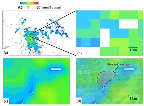 The process of calculating rainfall from weather radar precipitation data is illustrated in Figure 5. It shows precipitation measurements obtained from radar, where the color scale represents the rainfall intensity per square kilometer over a 10 min interval. To analyze a specific river basin, a region of interest is selected (Figure 5b). Due to the low resolution between radar measurement points, linear interpolation is applied between two radar calculation points (Figure 5c). The precipitation data are then mapped onto a grid over terrestrial maps (Figure 5d), allowing for the precise identification of river basins. The border polygon of the river basin was selected as the WGS84 polygon for each SHP, individually. When defining the river basin, factors such as mountain crests, watershed boundaries, and existing watercourses must be considered. Once the river catchment area is selected, the total rainfall for the area over a 10 min interval, denoted as ri, is calculated.