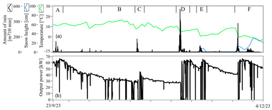 Comparison of environmental conditions and power production for run-of-river SHP1: (a) precipitation, snow height, and temperature; (b) output power.