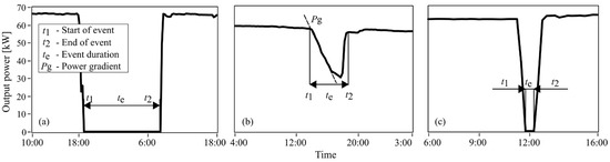 The start of the event (t1), the end of the event (t2), and the length of the event (te) are the most important attributes describing O&M events. Time duration (td) separates the long and short events. If te > td, then the power signal is classified as a long event (Figure 6a); if te < td, the signal is classified as a short event. If the power gradient Pg is within a predetermined range, a gradual event is detected. The attributes td and Pg are determined based on expert knowledge for each SHP individually.