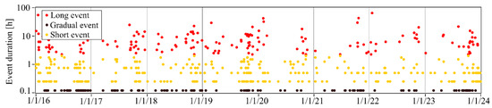 Figure 8 shows the events and the corresponding rainfall and duration over an eight-year period in SHP1. Since long events might be several times longer than short events, a logarithmic scale is used to denote event duration. Most of the events occurred during the second half of a year and during autumn, which correspond to leaf fall and high water flow rate periods.