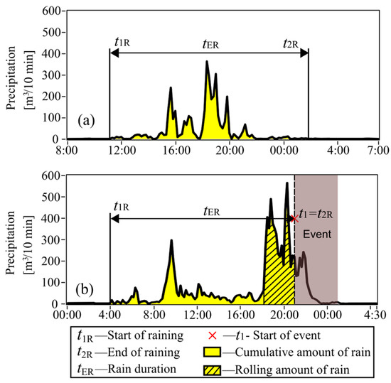 where and denote the start and end times of rainfall, respectively, and is the precipitation rate in mm/10 min at the i-th time interval.