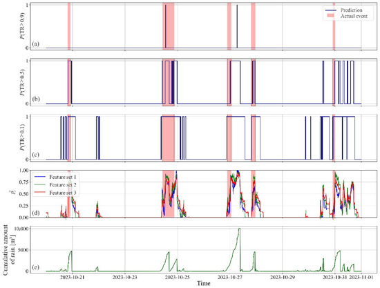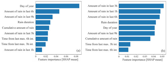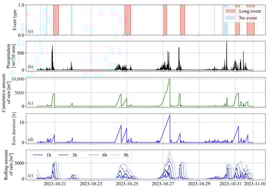 In the algorithm, the start and end of the raining period is parametrically defined using a threshold. This threshold directly influences the calculated rain duration, which can vary significantly depending on its value. In contrast, the rolling amount of rain (Figure 10e), which is calculated over the preceding 1, 3, 6, or 9 h, is not defined with the threshold parameter and is therefore a more reliable feature. Furthermore, these rolling features can also support the prediction of the event’s end, as water level typically takes time to recede below a certain operational threshold.