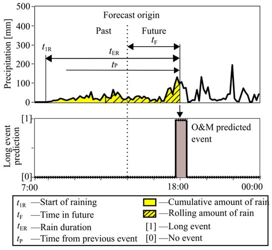 To predict O&M events, the same parameters used during O&M model training must be recalculated using both past and forecasted precipitation data. Past rainfall information is derived from radar images, while future precipitation is based on ALADIN forecasts, following the precipitation calculation methodology outlined in Section 2.3. For each forecast time step, tF, the features listed in Table 2 are computed (see Figure 11). These calculated features are then input into the trained O&M prediction model, allowing it to estimate the probability of upcoming O&M events.