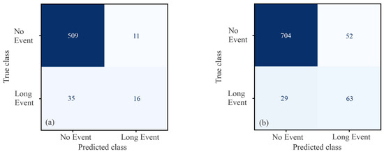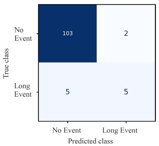 To evaluate the model from a long event perspective, four parameters from the confusion matrix are calculated: (1) overall classification accuracy, (2) precision, (3) recall, and (4) F1-score. Firstly, we define true positives (TPs), which are correctly predicted instances for each class, false positives (FPs), incorrectly predicted instances for each class, and false negatives (FNs), actual class, but predicted as something else. For the case shown in Figure 13, the TP(no_event) is 103, TP(long_event) is 5 (true no_event, predicted no_event), FP is 5 (predicted no_event, actually long_event), and FN is 2 (predicted long_event, actually no_event).