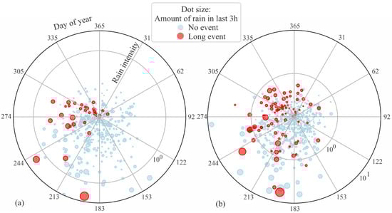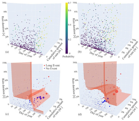 Figure 10a shows the detected events along with the corresponding feature values over time. The red shading shows the period of long events; the blue shading shows the raining period, which did not result in long event. Figure 10b shows the temporal distribution of precipitation. Figure 10c–e show the feature values calculated from Figure 10a,b as explained in Figure 9. A higher feature value corresponds to an increased probability of long event occurrence. Figure 10c,d reveals a strong relationship between the cumulative amount of rain and rain duration and the likelihood of a long event. Therefore, we calculate the parameter rain intensity, which is used for visual representation of data.