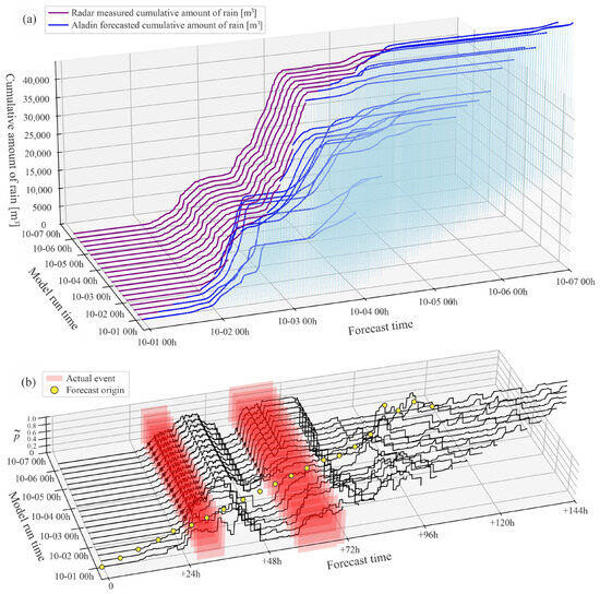 (a) Cumulative amount of radar measured and forecasted rain in the SHP1 river basin in the period from 1–7 October 2024. (b) Forecasted event probability.