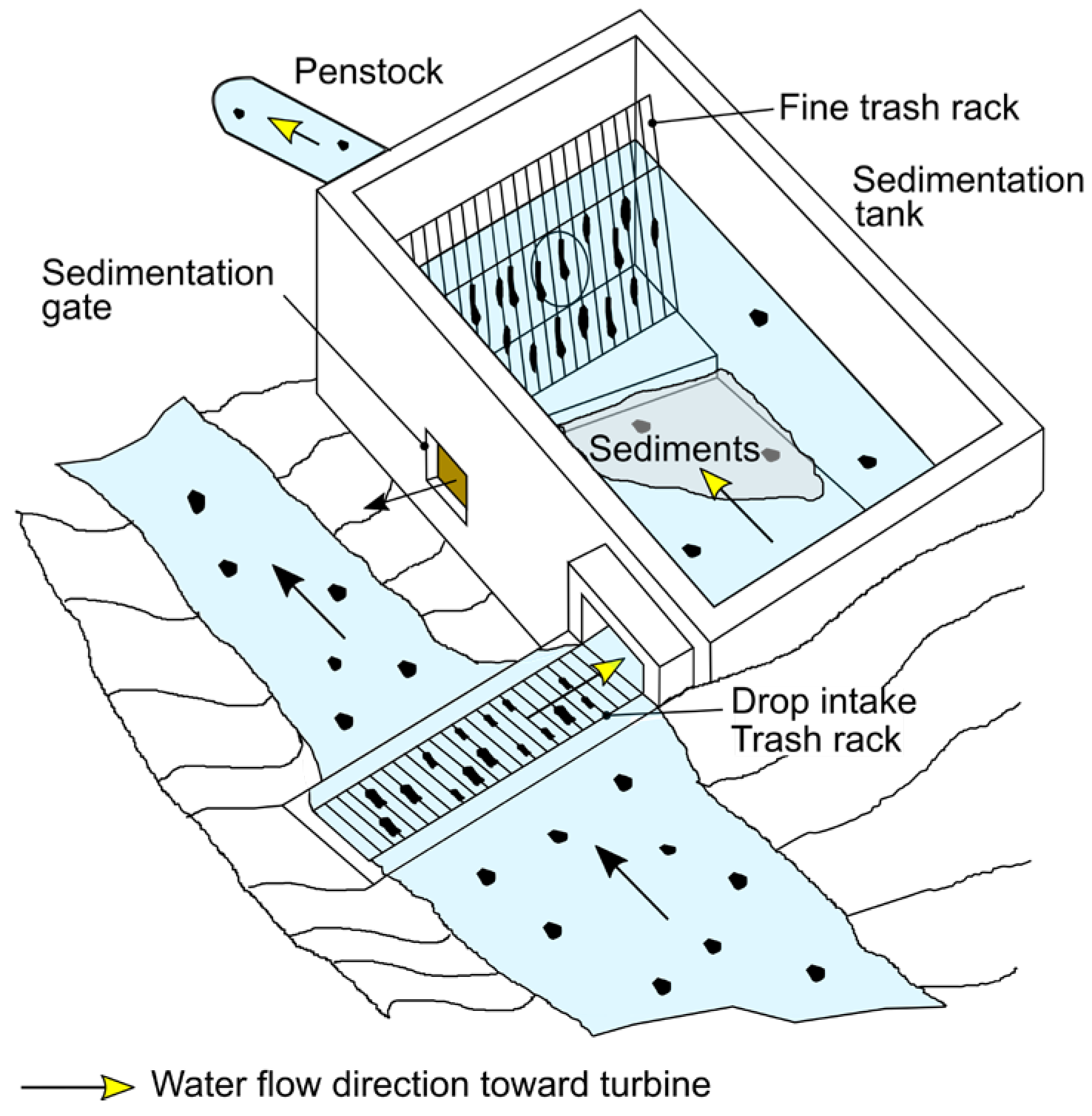 Figure 1). For low head applications, the settling tank may be integrated into the stream or turbine intake [