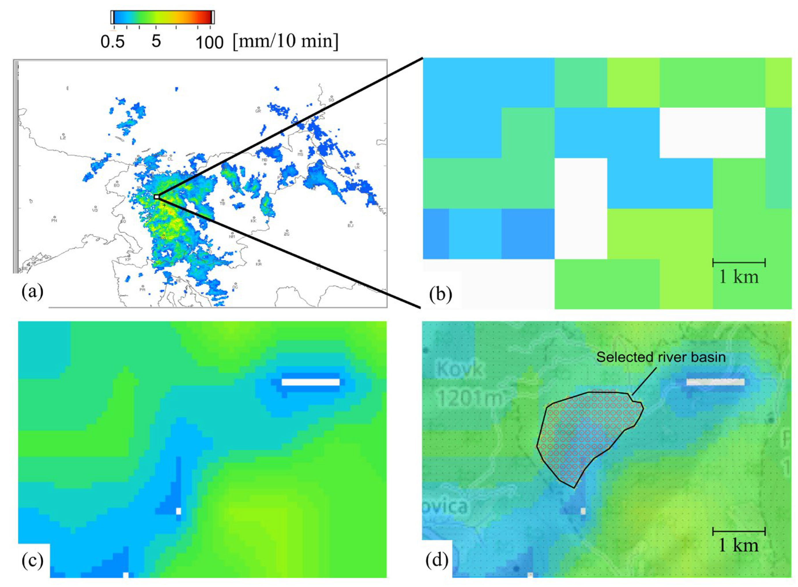 Precipitation measurements were collected from the WRM-200 weather radar, which provides 10 min interval radar images in GIF and GRIB formats. For the eleven most intensive rainy periods from August 2024 to April 2025, the regional ALADIN forecast data (GRIB format) were obtained as well. Each ALADIN model is run every six hours and ranges for 72 h in advance. Between these two models, another prediction is run which ranges 36 h in advance. Additional environmental parameters, including snow height, wind speed, temperature, and water flow rate, were sourced from the Slovenian Environment agency’s measuring stations [
