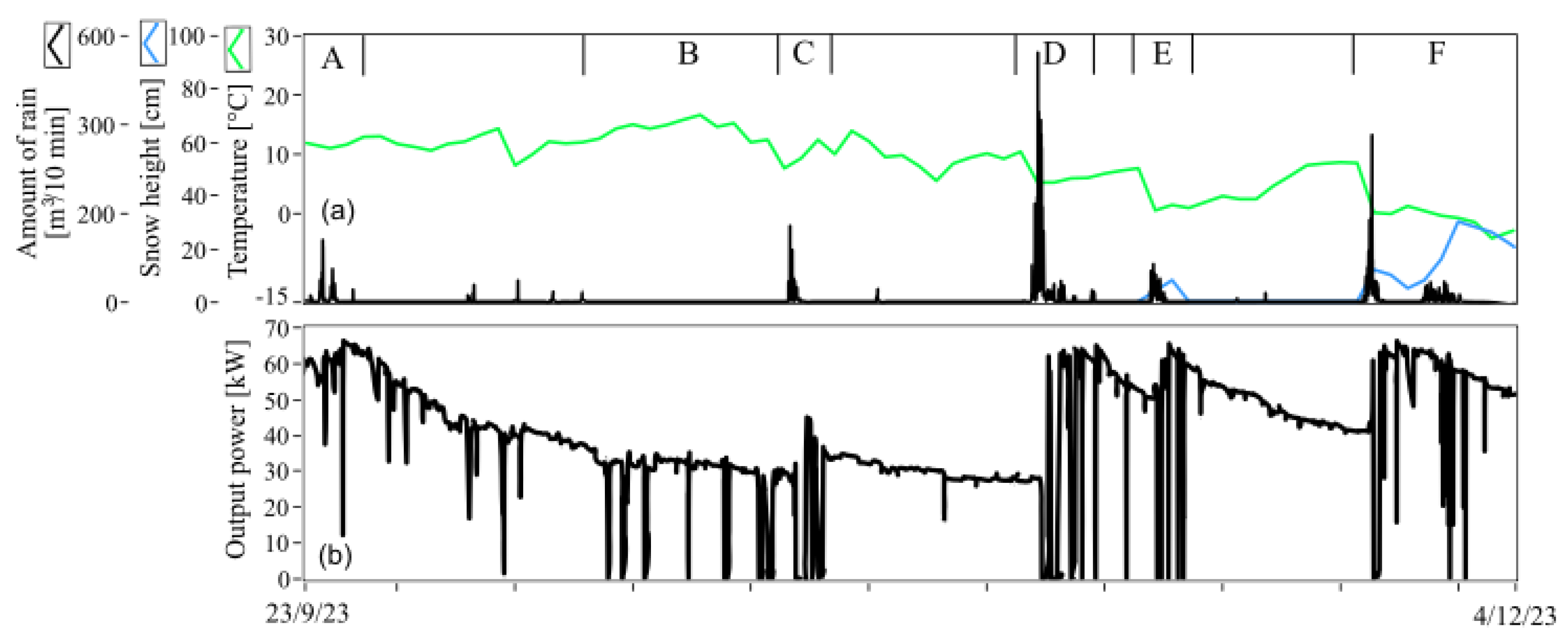 Environment-related O&M activities can be predicted with a certain probability in advance. These factors are particularly relevant for SHPs in torrential streams, which typically operate in mountainous (e.g., alpine) regions. Seasonal vegetation changes, rapid transitions from low to high water flow rates, sediment transport dynamics, water intake design, and susceptibility to sand and leaf blockages are among the most critical factors that complicate O&M prediction. A previous study [