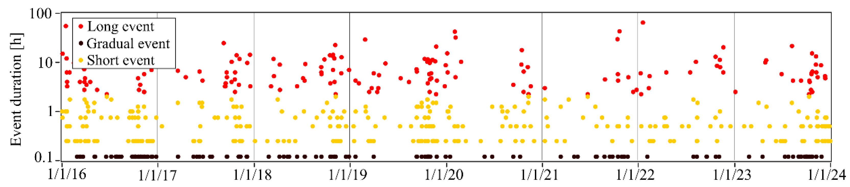The dataset consists of simultaneously acquired power production and environmental data over a period from 23 June 2018 to 12 April 2025. Despite the seven-year observation window, the dataset includes relatively few long events after filtering. This reduces statistical robustness and is an inherent limitation of the study.