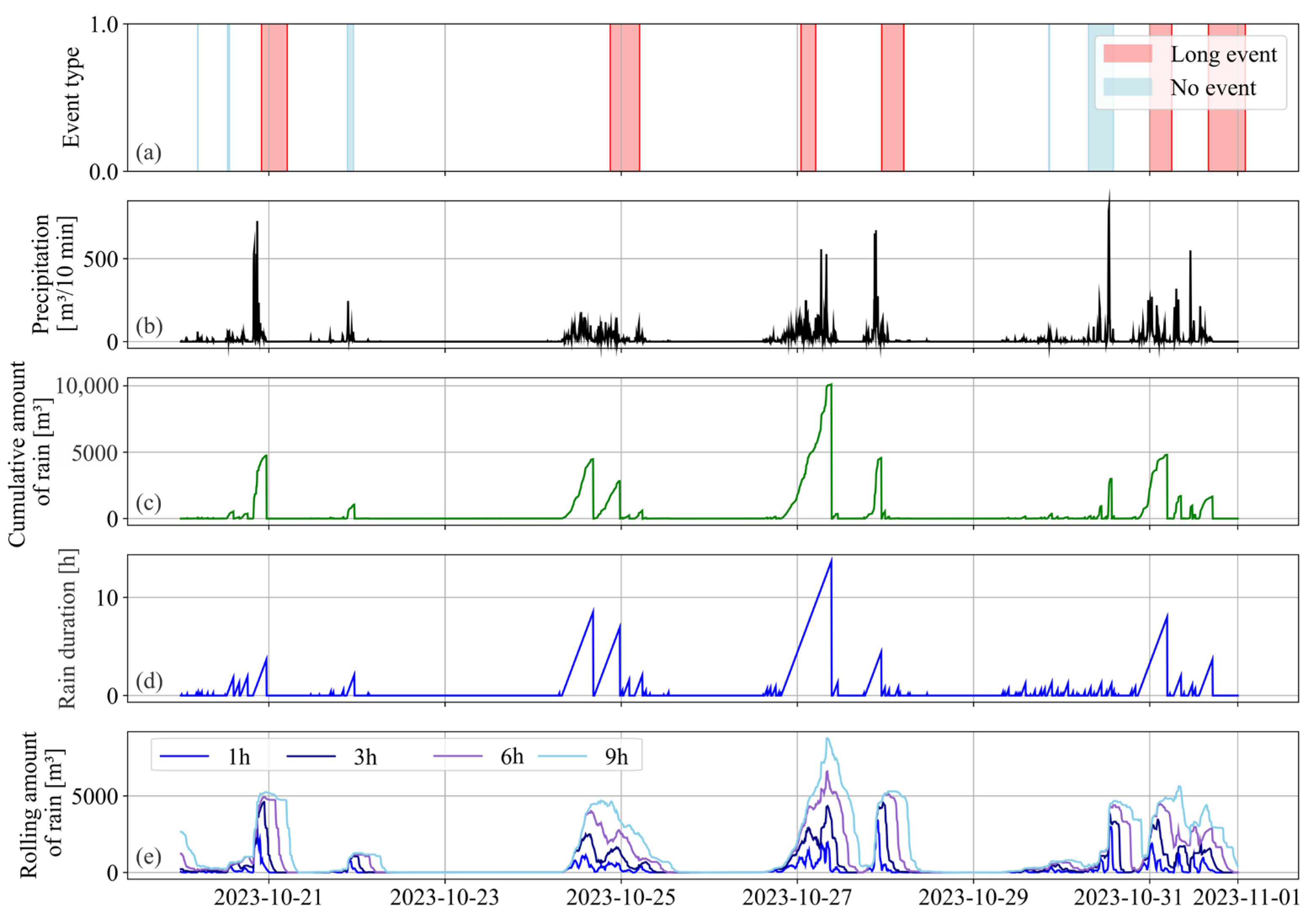 In the algorithm, the start and end of the raining period is parametrically defined using a threshold. This threshold directly influences the calculated rain duration, which can vary significantly depending on its value. In contrast, the rolling amount of rain (
