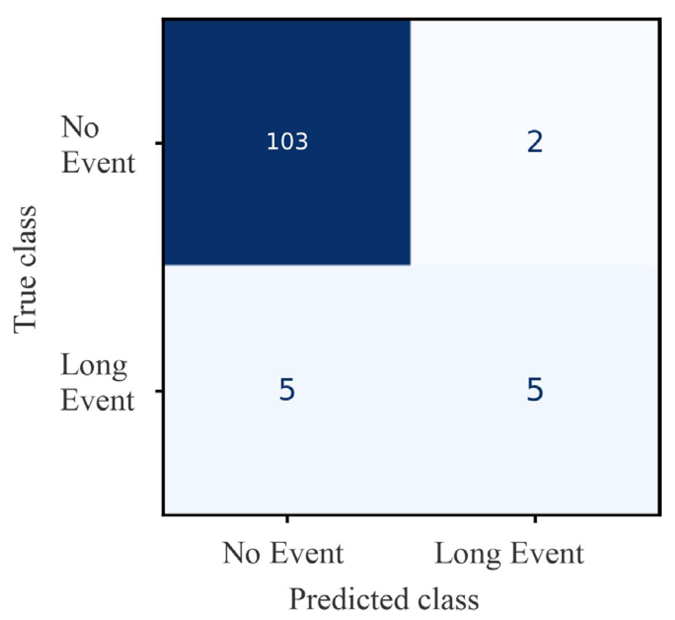 In SHP1, the best model correctly detected 36 long events, with 15 missed detections (false negatives) and 38 false alarms (false positives). In SHP2, the best model correctly detected 69 long events, with 23 missed detections and 42 false alarms. Both models exhibit similar trade-offs between false alarms and missed detections, but SHP2 achieves a more favorable balance between recall and precision, which is reflected in the higher F1-score.