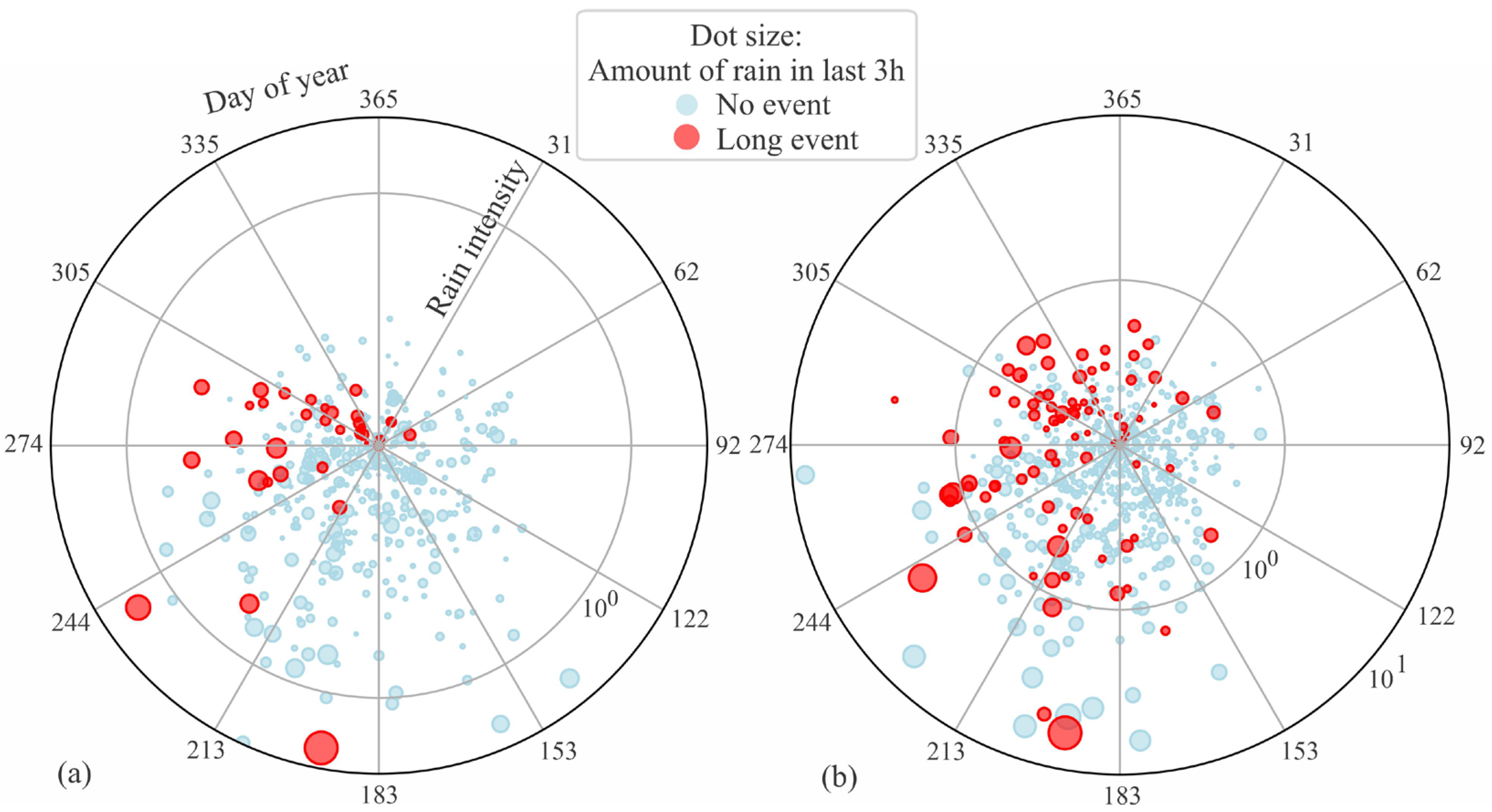 Figure 13. In total, in SHP1 there were 520 no_events and 51 long_events. In SHP2, there were 756 no_events and 92 long_events. In SHP1, most events occur in autumn. In other seasons, long events are typically triggered only when rainfall is substantial. However, some periods of intense rainfall do not result in events, while in autumn, even a small amount of rain can cause a long event. In SHP2, the seasonal distribution is relatively uniform from July to March, but there is a concentration of events during the summer months, where high-intensity rainfall leads to more frequent shutdowns compared to SHP1.