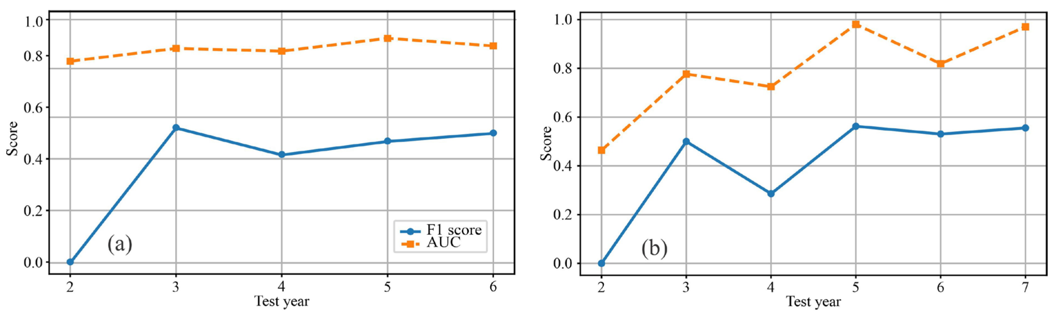 The question addressed in this analysis was how much data is needed to predict events. To evaluate this, we used the F1-score and the area under the ROC curve (AUC) as performance measures. The AUC measures the model’s ability to distinguish between classes, with 0.5 indicating random guessing and 1.0 indicating perfect separation. Initially, one year of data were used for training and the following unseen year for testing. Next, two years of data were used for training and one year for testing. In the final setup, six years of data were used for training and one year for testing.