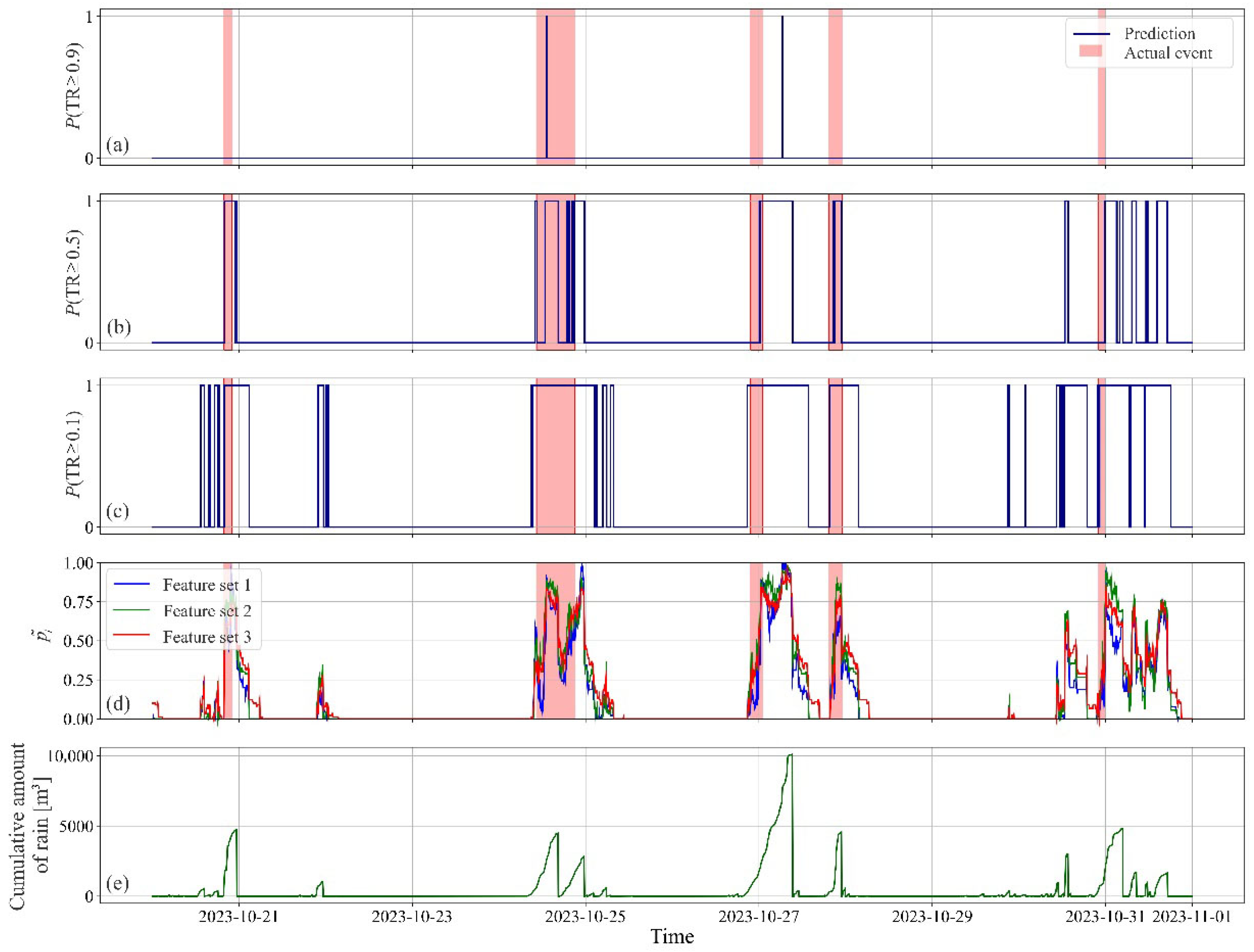 Figure 19b). Prior to the first event, a small amount of rain was recorded approximately 12 h before the actual onset, potentially contributing to early probability rises. The first event was shorter in duration than predicted. Part of this discrepancy can be attributed to the fact that event duration was not included as a feature in the training model, which may have reduced the accuracy of the duration prediction. For the second event, the predicted probability increased only after the rainfall had already occurred, indicating that the event probability was likely underestimated. However, this is due to the ALADIN uncertainty. In future work, the inherent variability of the ALADIN forecast model should also be explicitly incorporated.