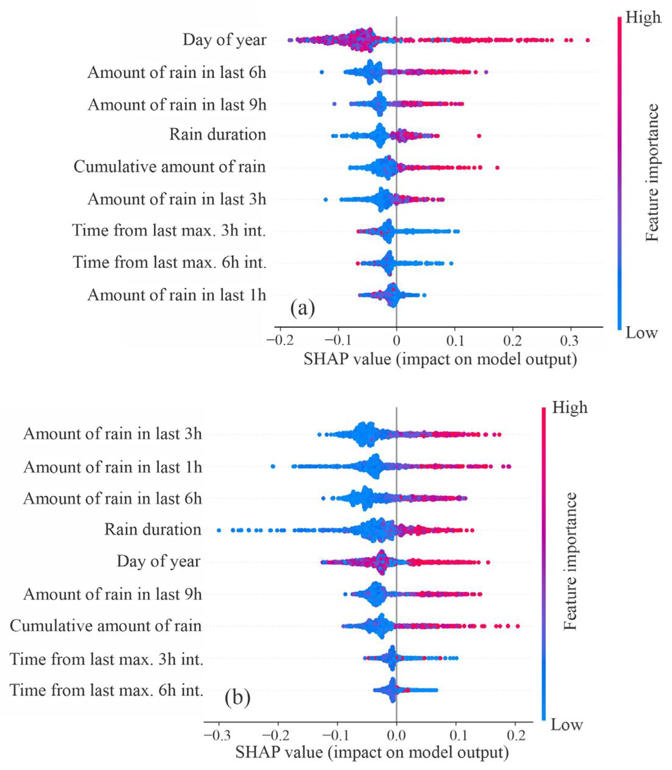 Figure 14b), the highest feature importance was achieved by amount_of_rain in the last 3 h, 1 h, 6 h and rain_duration. The day_of_year has a reduced importance of 0.041. This indicates a more direct dependence on recent rainfall accumulation rather than seasonality. The result may be explained with the distinctive technical characteristics of both SHPs. Since SHP1 uses the drop intake gate, which is more prone to leaf clogging, which mainly happens in the leaf fall period, even a small amount of rain can trigger a long event. On the other hand, events in SHP2 are triggered mainly due to the large amount of rain fall in the last 3, 1, 6, and 9 h. The SHP2 uses an automated trash rack debris removal system, which becomes clogged at higher water flow rates and the corresponding amount of debris. Therefore, only a large amount of rain may trigger the event. A detailed feature-level comparison based on the SHAP beeswarm plot is provided in