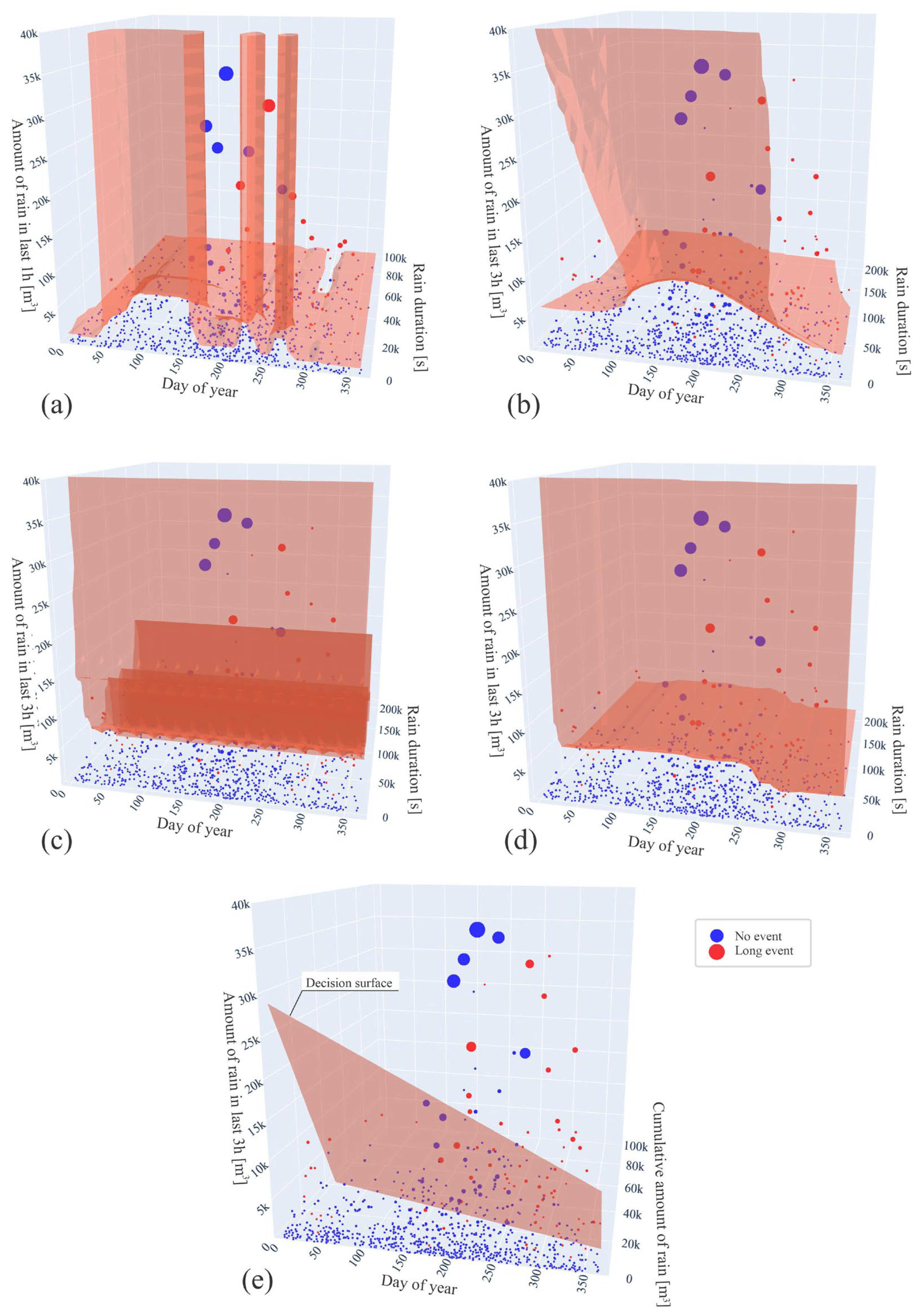Figure 15c,d indicates the model’s decision boundary where predicted probability reaches the classification threshold. The threshold level for SHP1 is 0.32 and 0.4 for SHP2, which were defined manually focusing on achieving the best separation surface between long and no events. In this way, the model was effectively evaluated, and overfitting was avoided. However, we found that the features day_of_year, rain_duration, and cumulative_amount of_rain were the most suitable for model visualization and manual evaluation.