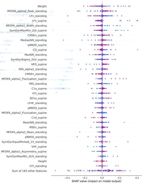The SHAP plot (Figure 1) illustrates the contribution of individual features to the ML model’s predictions for VVS in children. Features are ranked by their overall importance with each dot representing a single patient. The horizontal position indicates the SHAP value (impact on model output), where positive values increase the probability of syncope prediction and negative values decrease it. The color gradient represents feature values, with blue indicating lower values and pink/red indicating higher values for each respective variable. Weight emerged as the most influential feature, showing the widest distribution of SHAP values. Higher weight values (pink/red dots) were predominantly associated with positive SHAP values. The second most important feature was multifractal detrended fluctuation analysis (MFDFA)_alpha2_Peak during standing, a nonlinear HRV measure reflecting long-range fractal scaling properties of heart rate dynamics during orthostatic stress. Among frequency-domain indices, LFn (normalized low-frequency power) during both standing and supine positions ranked highly, with lower LFn values during standing (blue dots) showing positive SHAP contributions. Several MFDFA parameters from standing position appeared prominently, including MFDFA_alpha1_Width_standing, suggesting that alterations in multifractal properties during orthostatic challenge provide important discriminative information. Nonlinear measures from symbolic dynamics (SymDyn) and multiscale entropy (MSEn) families such as SymDynMaxMin_2LV_supine and CompositeMSEn_supine also demonstrated moderate importance, with their respective value distributions showing variable directional effects on predictions. Anthropometric variables, specifically height, ranked lower in importance, indicating that while body size contributes to the model, HRV-derived features provide more discriminative power for syncope prediction.