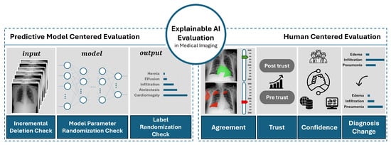 In this study, a structured and methodological evaluation approach for eXplainable Artificial Intelligence (XAI) methods in medical image classification is proposed and implemented using LIME and SHAP explanations for chest X-ray interpretations. The evaluation framework integrates two critical perspectives: predictive model-centered and human-centered evaluations. Predictive model-centered evaluations examine the explanations’ ability to reflect changes in input and output data and the internal model structure. Human-centered evaluations, conducted with 97 medical experts, assess trust, confidence, and agreements with AI’s indicative and contra-indicative reasoning as well as their changes before and after provision of explainability. Key findings of our study include explanation of sensitivity of LIME and SHAP to model changes, their effectiveness in identifying critical features, and SHAP’s significant impact on diagnosis changes. Our results show that both LIME and SHAP negatively affected contra-indicative agreement. Case-based analysis revealed AI explanations reinforce trust and agreement when participant’s initial diagnoses are correct. In these cases, SHAP effectively facilitated correct diagnostic changes. This study establishes a benchmark for future research in XAI for medical image analysis, providing a robust foundation for evaluating and comparing different XAI methods.