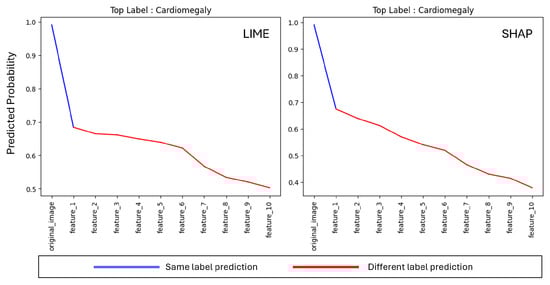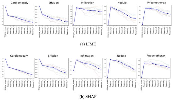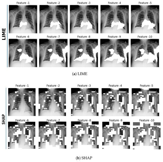 Subsequently, these features are incrementally masked with the average pixel value of the current X-ray scan sample. This approach simulates the gradual reduction in feature-specific information available to the predictive model. Each masking operation produces a new version of the input image (see Figure 2a for LIME and Figure 2b for SHAP), which is then fed back to the predictive model. After masking of each feature, the predictive probabilities are recalculated to monitor the changes in the model’s output.
